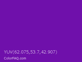 YUV 62.075,53.7,42.907 Color is a normal purple color and the nearest color is Purple #660099. Hex code #6f10ab and RGB value is rgb(111,16,171). In RGB color space, this color is composed of 44% red, 6% green, 67% blue, In CMYK color space, this color is composed of 35% cyan, 91% magenta, 0% yellow , 33% black , In HSL color space, this color has a hue angle of 277° , 83% saturation and 37% lightness.