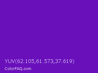 YUV 62.105,61.573,37.619 Color is a normal purple color and the nearest color is Purple Heart Crayola #652dc1. Hex code #6910bb and RGB value is rgb(105,16,187). In RGB color space, this color is composed of 41% red, 6% green, 73% blue, In CMYK color space, this color is composed of 44% cyan, 91% magenta, 0% yellow , 27% black , In HSL color space, this color has a hue angle of 271° , 84% saturation and 40% lightness.