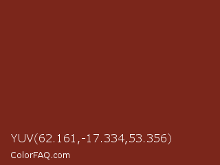 YUV 62.161,-17.334,53.356 Color is a dark red color and the nearest color is Mocha #782d19. Hex code #7b261b and RGB value is rgb(123,38,27). In RGB color space, this color is composed of 48% red, 15% green, 11% blue, In CMYK color space, this color is composed of 0% cyan, 69% magenta, 78% yellow , 52% black , In HSL color space, this color has a hue angle of 7° , 64% saturation and 29% lightness.