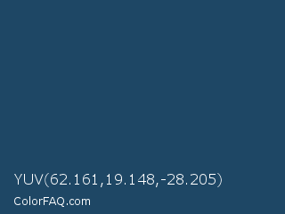 YUV 62.161,19.148,-28.205 Color is a dark blue color and the nearest color is Cello #1e385b. Hex code #1e4765 and RGB value is rgb(30,71,101). In RGB color space, this color is composed of 12% red, 28% green, 40% blue, In CMYK color space, this color is composed of 70% cyan, 30% magenta, 0% yellow , 60% black , In HSL color space, this color has a hue angle of 205° , 54% saturation and 26% lightness.