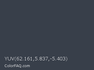 YUV 62.161,5.837,-5.403 Color is a dark blue color and the nearest color is Arsenic #3b444b. Hex code #383f4a and RGB value is rgb(56,63,74). In RGB color space, this color is composed of 22% red, 25% green, 29% blue, In CMYK color space, this color is composed of 24% cyan, 15% magenta, 0% yellow , 71% black , In HSL color space, this color has a hue angle of 217° , 14% saturation and 25% lightness.