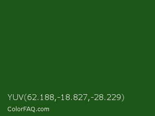 YUV 62.188,-18.827,-28.229 Color is a very dark green color and the nearest color is Green House #24500f. Hex code #1e5618 and RGB value is rgb(30,86,24). In RGB color space, this color is composed of 12% red, 34% green, 9% blue, In CMYK color space, this color is composed of 65% cyan, 0% magenta, 72% yellow , 66% black , In HSL color space, this color has a hue angle of 114° , 56% saturation and 22% lightness.