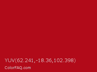 YUV 62.241,-18.36,102.398 Color is a normal red color and the nearest color is Carnelian #b31b1b. Hex code #b30a19 and RGB value is rgb(179,10,25). In RGB color space, this color is composed of 70% red, 4% green, 10% blue, In CMYK color space, this color is composed of 0% cyan, 94% magenta, 86% yellow , 30% black , In HSL color space, this color has a hue angle of 355° , 89% saturation and 37% lightness.