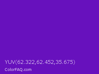 YUV 62.322,62.452,35.675 Color is a normal violet color and the nearest color is Purple Heart Crayola #652dc1. Hex code #6711bd and RGB value is rgb(103,17,189). In RGB color space, this color is composed of 40% red, 7% green, 74% blue, In CMYK color space, this color is composed of 46% cyan, 91% magenta, 0% yellow , 26% black , In HSL color space, this color has a hue angle of 270° , 83% saturation and 40% lightness.