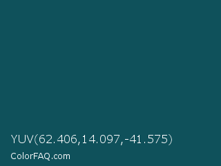YUV 62.406,14.097,-41.575 Color is a very dark cyan color and the nearest color is Deep Sea Green #095859. Hex code #0f515b and RGB value is rgb(15,81,91). In RGB color space, this color is composed of 6% red, 32% green, 36% blue, In CMYK color space, this color is composed of 84% cyan, 11% magenta, 0% yellow , 64% black , In HSL color space, this color has a hue angle of 188° , 72% saturation and 21% lightness.
