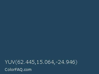 YUV 62.445,15.064,-24.946 Color is a dark blue color and the nearest color is Blue Dianne #204852. Hex code #22475d and RGB value is rgb(34,71,93). In RGB color space, this color is composed of 13% red, 28% green, 36% blue, In CMYK color space, this color is composed of 63% cyan, 24% magenta, 0% yellow , 64% black , In HSL color space, this color has a hue angle of 202° , 46% saturation and 25% lightness.