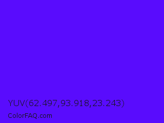 YUV 62.497,93.918,23.243 Color is a normal indigo color and the nearest color is Han Purple #5218fa. Hex code #590cfd and RGB value is rgb(89,12,253). In RGB color space, this color is composed of 35% red, 5% green, 99% blue, In CMYK color space, this color is composed of 65% cyan, 95% magenta, 0% yellow , 1% black , In HSL color space, this color has a hue angle of 259° , 98% saturation and 52% lightness.