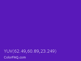 YUV 62.49,60.89,23.249 Color is a normal violet color and the nearest color is Purple Heart Crayola #652dc1. Hex code #5919ba and RGB value is rgb(89,25,186). In RGB color space, this color is composed of 35% red, 10% green, 73% blue, In CMYK color space, this color is composed of 52% cyan, 87% magenta, 0% yellow , 27% black , In HSL color space, this color has a hue angle of 264° , 76% saturation and 41% lightness.