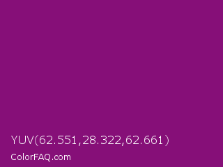 YUV 62.551,28.322,62.661 Color is a dark magenta color and the nearest color is Patriarch #800080. Hex code #860f78 and RGB value is rgb(134,15,120). In RGB color space, this color is composed of 53% red, 6% green, 47% blue, In CMYK color space, this color is composed of 0% cyan, 89% magenta, 10% yellow , 47% black , In HSL color space, this color has a hue angle of 307° , 80% saturation and 29% lightness.