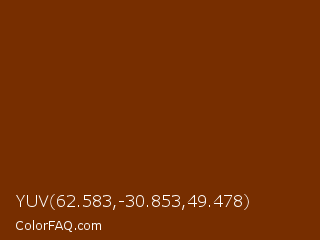YUV 62.583,-30.853,49.478 Color is a dark orange color and the nearest color is Red Beech #7b3801. Hex code #772e00 and RGB value is rgb(119,46,-0). In RGB color space, this color is composed of 47% red, 18% green, 0% blue, In CMYK color space, this color is composed of 0% cyan, 61% magenta, 100% yellow , 53% black , In HSL color space, this color has a hue angle of 23° , 100% saturation and 23% lightness.