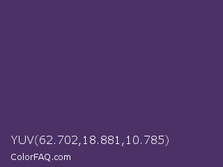 YUV 62.702,18.881,10.785 Color is a dark violet color and the nearest color is Bossanova #4e2a5a. Hex code #4b3165 and RGB value is rgb(75,49,101). In RGB color space, this color is composed of 29% red, 19% green, 40% blue, In CMYK color space, this color is composed of 26% cyan, 51% magenta, 0% yellow , 60% black , In HSL color space, this color has a hue angle of 270° , 35% saturation and 29% lightness.
