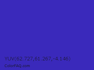YUV 62.727,61.267,-4.146 Color is a normal indigo color and the nearest color is Governor Bay #2f3cb3. Hex code #3a29bb and RGB value is rgb(58,41,187). In RGB color space, this color is composed of 23% red, 16% green, 73% blue, In CMYK color space, this color is composed of 69% cyan, 78% magenta, 0% yellow , 27% black , In HSL color space, this color has a hue angle of 247° , 64% saturation and 45% lightness.