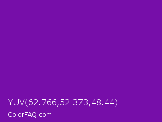 YUV 62.766,52.373,48.44 Color is a normal purple color and the nearest color is Violet RYB #8601af. Hex code #760ea9 and RGB value is rgb(118,14,169). In RGB color space, this color is composed of 46% red, 5% green, 66% blue, In CMYK color space, this color is composed of 30% cyan, 92% magenta, 0% yellow , 34% black , In HSL color space, this color has a hue angle of 280° , 85% saturation and 36% lightness.