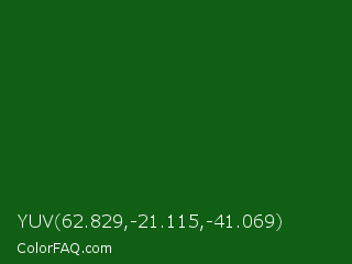 YUV 62.829,-21.115,-41.069 Color is a very dark green color and the nearest color is San Felix #0b6207. Hex code #105f14 and RGB value is rgb(16,95,20). In RGB color space, this color is composed of 6% red, 37% green, 8% blue, In CMYK color space, this color is composed of 83% cyan, 0% magenta, 79% yellow , 63% black , In HSL color space, this color has a hue angle of 123° , 71% saturation and 22% lightness.