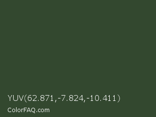 YUV 62.871,-7.824,-10.411 Color is a dark green color and the nearest color is Kombu Green #354230. Hex code #33482f and RGB value is rgb(51,72,47). In RGB color space, this color is composed of 20% red, 28% green, 18% blue, In CMYK color space, this color is composed of 29% cyan, 0% magenta, 35% yellow , 72% black , In HSL color space, this color has a hue angle of 110° , 21% saturation and 23% lightness.