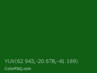 YUV 62.943,-20.678,-41.169 Color is a very dark green color and the nearest color is San Felix #0b6207. Hex code #105f15 and RGB value is rgb(16,95,21). In RGB color space, this color is composed of 6% red, 37% green, 8% blue, In CMYK color space, this color is composed of 83% cyan, 0% magenta, 78% yellow , 63% black , In HSL color space, this color has a hue angle of 124° , 71% saturation and 22% lightness.