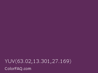 YUV 63.02,13.301,27.169 Color is a dark magenta color and the nearest color is Japanese Violet #5b3256. Hex code #5e2a5a and RGB value is rgb(94,42,90). In RGB color space, this color is composed of 37% red, 16% green, 35% blue, In CMYK color space, this color is composed of 0% cyan, 55% magenta, 4% yellow , 63% black , In HSL color space, this color has a hue angle of 305° , 38% saturation and 27% lightness.