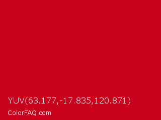 YUV 63.177,-17.835,120.871 Color is a normal red color and the nearest color is Monza #c7031e. Hex code #c9001b and RGB value is rgb(201,-0,27). In RGB color space, this color is composed of 79% red, 0% green, 11% blue, In CMYK color space, this color is composed of 0% cyan, 100% magenta, 87% yellow , 21% black , In HSL color space, this color has a hue angle of 352° , 100% saturation and 39% lightness.