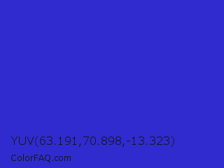 YUV 63.191,70.898,-13.323 Color is a normal indigo color and the nearest color is Palatinate Blue #273be2. Hex code #302bcf and RGB value is rgb(48,43,207). In RGB color space, this color is composed of 19% red, 17% green, 81% blue, In CMYK color space, this color is composed of 77% cyan, 79% magenta, 0% yellow , 19% black , In HSL color space, this color has a hue angle of 242° , 66% saturation and 49% lightness.