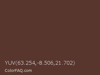 YUV 63.254,-8.506,21.702 Color is a dark red color and the nearest color is Congo Brown #593737. Hex code #58362e and RGB value is rgb(88,54,46). In RGB color space, this color is composed of 35% red, 21% green, 18% blue, In CMYK color space, this color is composed of 0% cyan, 39% magenta, 48% yellow , 65% black , In HSL color space, this color has a hue angle of 11° , 31% saturation and 26% lightness.