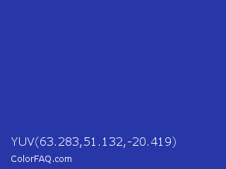 YUV 63.283,51.132,-20.419 Color is a normal blue color and the nearest color is Governor Bay #2f3cb3. Hex code #2837a7 and RGB value is rgb(40,55,167). In RGB color space, this color is composed of 16% red, 22% green, 65% blue, In CMYK color space, this color is composed of 76% cyan, 67% magenta, 0% yellow , 35% black , In HSL color space, this color has a hue angle of 233° , 61% saturation and 41% lightness.