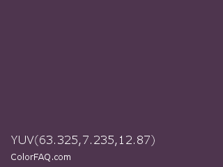 YUV 63.325,7.235,12.87 Color is a dark magenta color and the nearest color is Voodoo #533455. Hex code #4e354e and RGB value is rgb(78,53,78). In RGB color space, this color is composed of 31% red, 21% green, 31% blue, In CMYK color space, this color is composed of 0% cyan, 32% magenta, 0% yellow , 69% black , In HSL color space, this color has a hue angle of 300° , 19% saturation and 26% lightness.