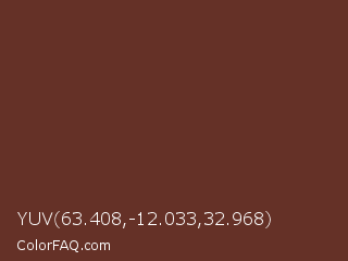 YUV 63.408,-12.033,32.968 Color is a dark red color and the nearest color is Buccaneer #622f30. Hex code #653127 and RGB value is rgb(101,49,39). In RGB color space, this color is composed of 40% red, 19% green, 15% blue, In CMYK color space, this color is composed of 0% cyan, 51% magenta, 61% yellow , 60% black , In HSL color space, this color has a hue angle of 10° , 44% saturation and 27% lightness.
