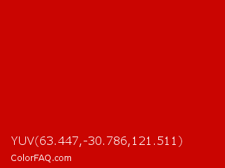 YUV 63.447,-30.786,121.511 Color is a normal red color and the nearest color is Boston University Red #cc0000. Hex code #ca0501 and RGB value is rgb(202,5,1). In RGB color space, this color is composed of 79% red, 2% green, 0% blue, In CMYK color space, this color is composed of 0% cyan, 98% magenta, 100% yellow , 21% black , In HSL color space, this color has a hue angle of 1° , 99% saturation and 40% lightness.