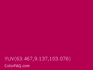 YUV 63.467,9.137,103.076 Color is a normal rose color and the nearest color is Pictorial Carmine #c30b4e. Hex code #b50052 and RGB value is rgb(181,-0,82). In RGB color space, this color is composed of 71% red, 0% green, 32% blue, In CMYK color space, this color is composed of 0% cyan, 100% magenta, 55% yellow , 29% black , In HSL color space, this color has a hue angle of 333° , 100% saturation and 35% lightness.