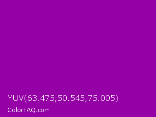 YUV 63.475,50.545,75.005 Color is a normal magenta color and the nearest color is Violet RYB #8601af. Hex code #9500a6 and RGB value is rgb(149,-0,166). In RGB color space, this color is composed of 58% red, 0% green, 65% blue, In CMYK color space, this color is composed of 10% cyan, 100% magenta, 0% yellow , 35% black , In HSL color space, this color has a hue angle of 294° , 100% saturation and 33% lightness.