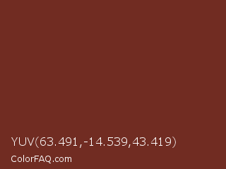 YUV 63.491,-14.539,43.419 Color is a dark red color and the nearest color is Metallic Copper #71291d. Hex code #712c22 and RGB value is rgb(113,44,34). In RGB color space, this color is composed of 44% red, 17% green, 13% blue, In CMYK color space, this color is composed of 0% cyan, 61% magenta, 70% yellow , 56% black , In HSL color space, this color has a hue angle of 8° , 54% saturation and 29% lightness.