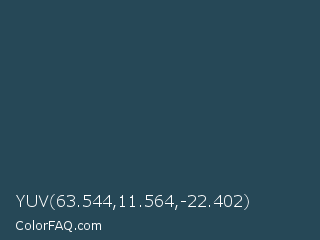 YUV 63.544,11.564,-22.402 Color is a dark blue color and the nearest color is Blue Dianne #204852. Hex code #264857 and RGB value is rgb(38,72,87). In RGB color space, this color is composed of 15% red, 28% green, 34% blue, In CMYK color space, this color is composed of 56% cyan, 17% magenta, 0% yellow , 66% black , In HSL color space, this color has a hue angle of 198° , 39% saturation and 25% lightness.