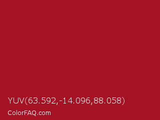 YUV 63.592,-14.096,88.058 Color is a normal red color and the nearest color is Ruby Red #9b111e. Hex code #a41223 and RGB value is rgb(164,18,35). In RGB color space, this color is composed of 64% red, 7% green, 14% blue, In CMYK color space, this color is composed of 0% cyan, 89% magenta, 79% yellow , 36% black , In HSL color space, this color has a hue angle of 353° , 80% saturation and 36% lightness.