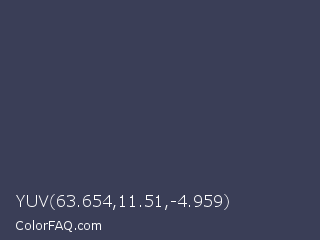 YUV 63.654,11.51,-4.959 Color is a dark blue color and the nearest color is Bright Gray #3c4151. Hex code #3a3e57 and RGB value is rgb(58,62,87). In RGB color space, this color is composed of 23% red, 24% green, 34% blue, In CMYK color space, this color is composed of 33% cyan, 29% magenta, 0% yellow , 66% black , In HSL color space, this color has a hue angle of 232° , 20% saturation and 28% lightness.
