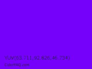 YUV 63.711,92.826,46.734 Color is a normal violet color and the nearest color is Electric Indigo #6f00ff. Hex code #7500fc and RGB value is rgb(117,-0,252). In RGB color space, this color is composed of 46% red, 0% green, 99% blue, In CMYK color space, this color is composed of 54% cyan, 100% magenta, 0% yellow , 1% black , In HSL color space, this color has a hue angle of 268° , 100% saturation and 49% lightness.