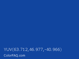 YUV 63.712,46.977,-40.966 Color is a normal blue color and the nearest color is Yale Blue #0f4d92. Hex code #11459f and RGB value is rgb(17,69,159). In RGB color space, this color is composed of 7% red, 27% green, 62% blue, In CMYK color space, this color is composed of 89% cyan, 57% magenta, 0% yellow , 38% black , In HSL color space, this color has a hue angle of 218° , 81% saturation and 35% lightness.