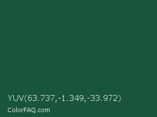 YUV 63.737,-1.349,-33.972 Color is a very dark green color and the nearest color is Brunswick Green #1b4d3e. Hex code #19543d and RGB value is rgb(25,84,61). In RGB color space, this color is composed of 10% red, 33% green, 24% blue, In CMYK color space, this color is composed of 70% cyan, 0% magenta, 27% yellow , 67% black , In HSL color space, this color has a hue angle of 157° , 54% saturation and 21% lightness.