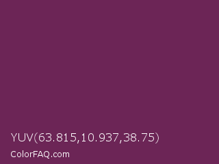 YUV 63.815,10.937,38.75 Color is a dark magenta color and the nearest color is Finn #692d54. Hex code #6c2556 and RGB value is rgb(108,37,86). In RGB color space, this color is composed of 42% red, 15% green, 34% blue, In CMYK color space, this color is composed of 0% cyan, 66% magenta, 20% yellow , 58% black , In HSL color space, this color has a hue angle of 319° , 49% saturation and 28% lightness.
