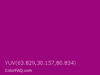 YUV 63.829,30.157,80.834 Color is a normal magenta color and the nearest color is Flirt #a2006d. Hex code #9c057d and RGB value is rgb(156,5,125). In RGB color space, this color is composed of 61% red, 2% green, 49% blue, In CMYK color space, this color is composed of 0% cyan, 97% magenta, 20% yellow , 39% black , In HSL color space, this color has a hue angle of 312° , 94% saturation and 32% lightness.