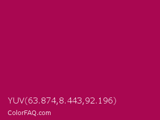 YUV 63.874,8.443,92.196 Color is a normal rose color and the nearest color is Jazzberry Jam #a50b5e. Hex code #a90751 and RGB value is rgb(169,7,81). In RGB color space, this color is composed of 66% red, 3% green, 32% blue, In CMYK color space, this color is composed of 0% cyan, 96% magenta, 52% yellow , 34% black , In HSL color space, this color has a hue angle of 333° , 92% saturation and 35% lightness.