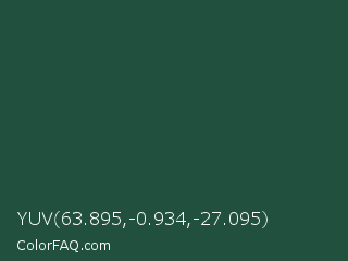 YUV 63.895,-0.934,-27.095 Color is a very dark green color and the nearest color is Brunswick Green #1b4d3e. Hex code #21503e and RGB value is rgb(33,80,62). In RGB color space, this color is composed of 13% red, 31% green, 24% blue, In CMYK color space, this color is composed of 59% cyan, 0% magenta, 23% yellow , 69% black , In HSL color space, this color has a hue angle of 157° , 42% saturation and 22% lightness.