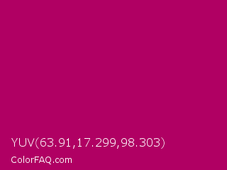 YUV 63.91,17.299,98.303 Color is a normal magenta color and the nearest color is Lipstick #ab0563. Hex code #b00063 and RGB value is rgb(176,-0,99). In RGB color space, this color is composed of 69% red, 0% green, 39% blue, In CMYK color space, this color is composed of 0% cyan, 100% magenta, 44% yellow , 31% black , In HSL color space, this color has a hue angle of 326° , 100% saturation and 35% lightness.