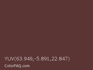 YUV 63.949,-5.891,22.847 Color is a dark red color and the nearest color is Congo Brown #593737. Hex code #5a3534 and RGB value is rgb(90,53,52). In RGB color space, this color is composed of 35% red, 21% green, 20% blue, In CMYK color space, this color is composed of 0% cyan, 41% magenta, 42% yellow , 65% black , In HSL color space, this color has a hue angle of 2° , 27% saturation and 28% lightness.