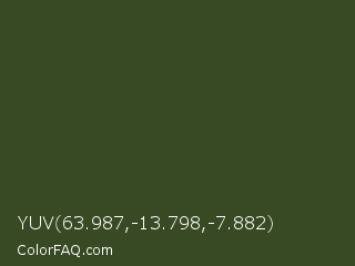 YUV 63.987,-13.798,-7.882 Color is a very dark green color and the nearest color is Kombu Green #354230. Hex code #374a24 and RGB value is rgb(55,74,36). In RGB color space, this color is composed of 22% red, 29% green, 14% blue, In CMYK color space, this color is composed of 26% cyan, 0% magenta, 51% yellow , 71% black , In HSL color space, this color has a hue angle of 90° , 35% saturation and 22% lightness.