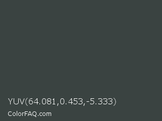 YUV 64.081,0.453,-5.333 Color is a dark cyan color and the nearest color is Cape Cod #3c4443. Hex code #3a4341 and RGB value is rgb(58,67,65). In RGB color space, this color is composed of 23% red, 26% green, 25% blue, In CMYK color space, this color is composed of 13% cyan, 0% magenta, 3% yellow , 74% black , In HSL color space, this color has a hue angle of 167° , 7% saturation and 25% lightness.