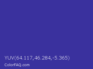 YUV 64.117,46.284,-5.365 Color is a normal indigo color and the nearest color is Blue Pigment #333399. Hex code #3a319e and RGB value is rgb(58,49,158). In RGB color space, this color is composed of 23% red, 19% green, 62% blue, In CMYK color space, this color is composed of 63% cyan, 69% magenta, 0% yellow , 38% black , In HSL color space, this color has a hue angle of 245° , 53% saturation and 41% lightness.