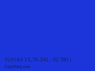 YUV 64.15,76.341,-32.581 Color is a normal blue color and the nearest color is Palatinate Blue #273be2. Hex code #1b35db and RGB value is rgb(27,53,219). In RGB color space, this color is composed of 11% red, 21% green, 86% blue, In CMYK color space, this color is composed of 88% cyan, 76% magenta, 0% yellow , 14% black , In HSL color space, this color has a hue angle of 232° , 78% saturation and 48% lightness.