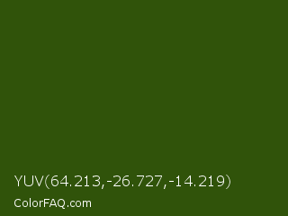 YUV 64.213,-26.727,-14.219 Color is a very dark green color and the nearest color is Green House #24500f. Hex code #30530a and RGB value is rgb(48,83,10). In RGB color space, this color is composed of 19% red, 33% green, 4% blue, In CMYK color space, this color is composed of 42% cyan, 0% magenta, 88% yellow , 67% black , In HSL color space, this color has a hue angle of 89° , 78% saturation and 18% lightness.
