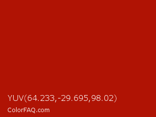 YUV 64.233,-29.695,98.02 Color is a normal red color and the nearest color is Milano Red #b81104. Hex code #b01304 and RGB value is rgb(176,19,4). In RGB color space, this color is composed of 69% red, 7% green, 2% blue, In CMYK color space, this color is composed of 0% cyan, 89% magenta, 98% yellow , 31% black , In HSL color space, this color has a hue angle of 5° , 96% saturation and 35% lightness.
