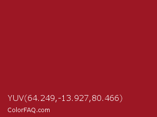 YUV 64.249,-13.927,80.466 Color is a normal red color and the nearest color is Ruby Red #9b111e. Hex code #9c1724 and RGB value is rgb(156,23,36). In RGB color space, this color is composed of 61% red, 9% green, 14% blue, In CMYK color space, this color is composed of 0% cyan, 85% magenta, 77% yellow , 39% black , In HSL color space, this color has a hue angle of 354° , 74% saturation and 35% lightness.